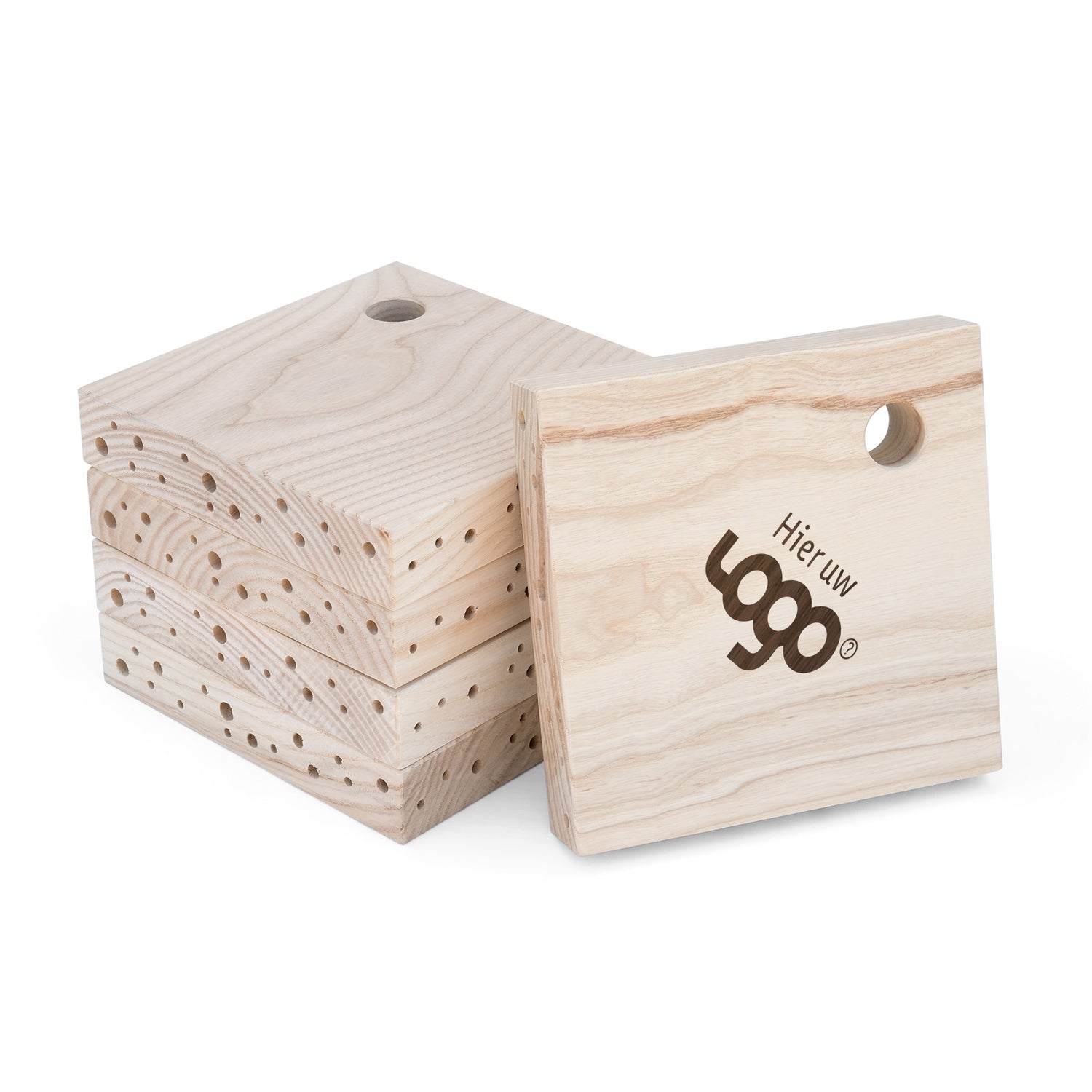 Jouw logo komt op het bijenhotel te staan. In een klein doosje verpakt met een houten spijker er bij! Vanaf 10 stuks te bestellen. De bijenhotels worden van diverse houtsoorten gemaakt.