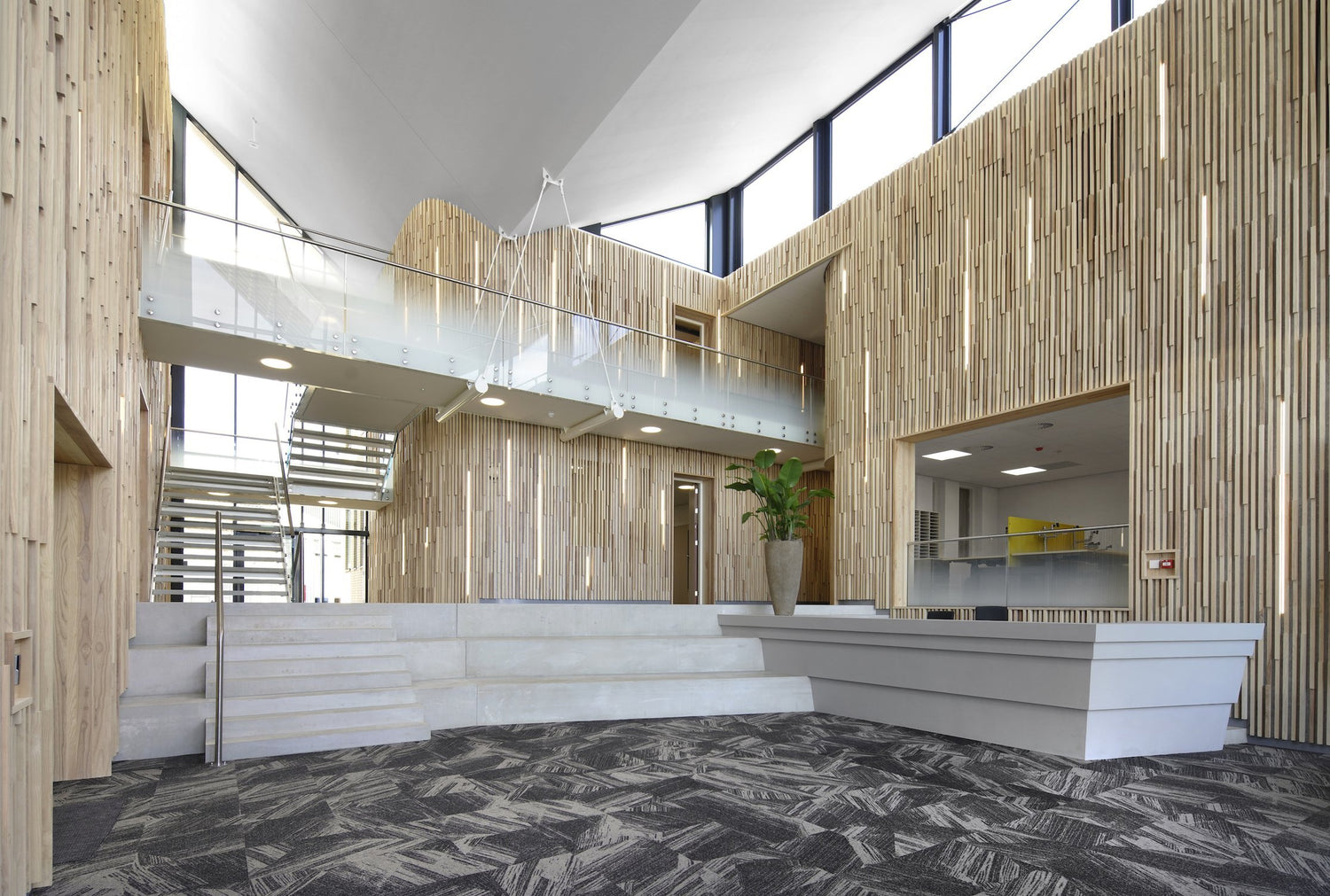 Deze entree van Salverda hangt vol met maar liefst 7 kilometer Zwols essenhout afkomstig uit de Essentaksterfte. Niet versnipperd en verbrand, maar circulair inzet van Nederlands hout!